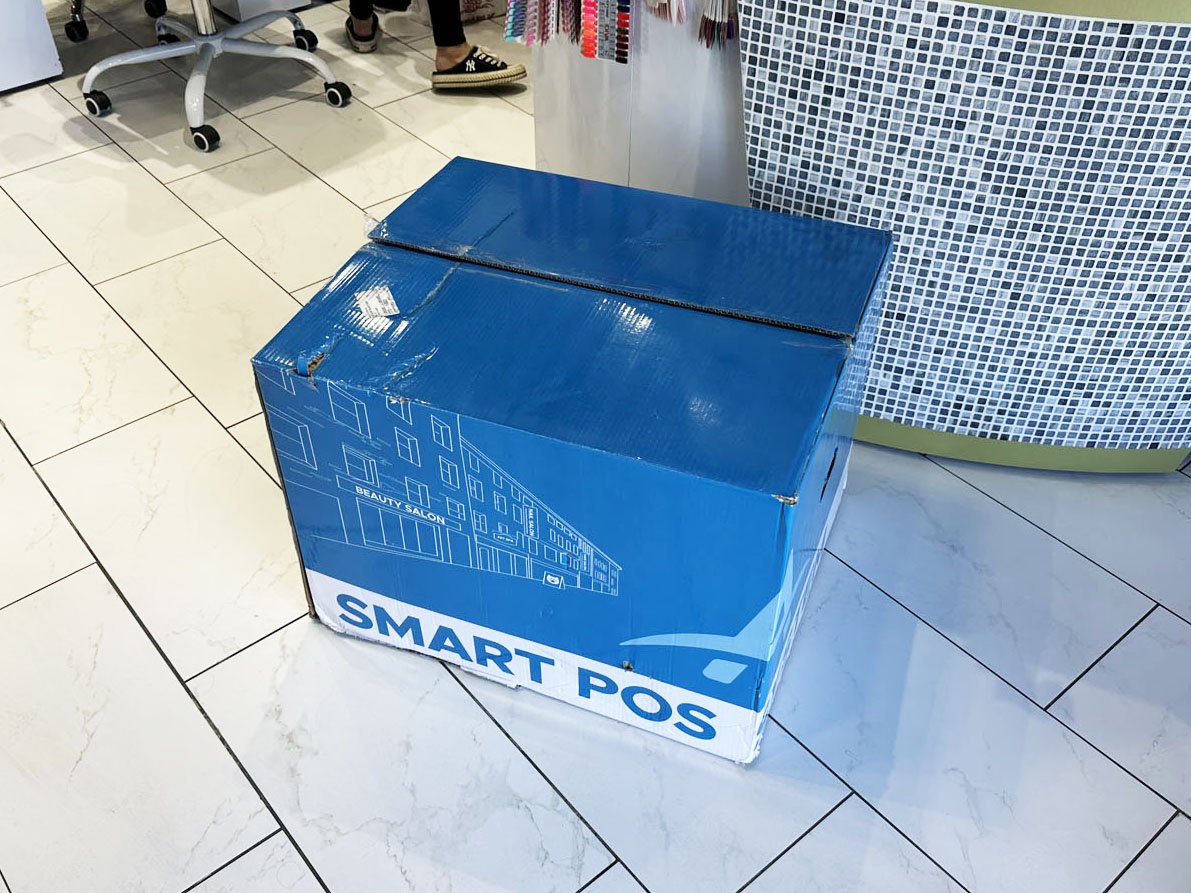 The NailSoft AiO was shipped directly to the store in a large blue box with “Aurora-In-One Smart POS” written on it. Ask the Store Manager for this box and bring it to their front desk. Confirm the general placement with the manager for where they want the NailSoft AiO to be installed so you know where to unbox the equipment (you’ll confirm the exact placements of each piece in the next steps).